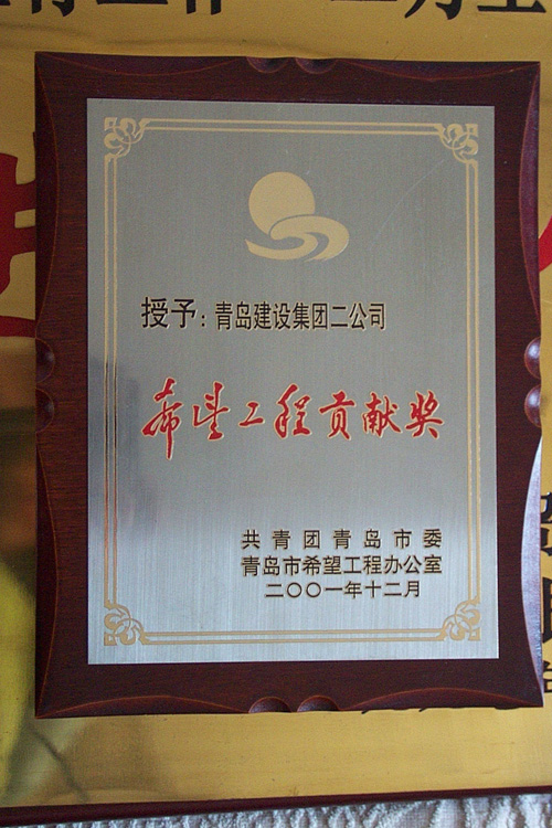 2001年為希望工程捐款20萬(wàn)元,援助西部貧困山區(qū)建設(shè)希望學(xué)校,被團(tuán)市委、青島市希望工程辦公室授予“希望工程貢獻(xiàn)獎(jiǎng)”