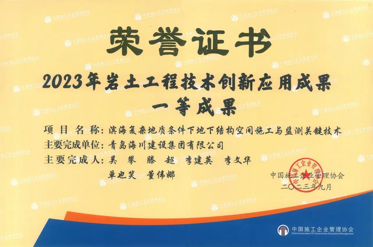創(chuàng)新賦能 科技爭(zhēng)先 | 青島海川建設(shè)集團(tuán)榮獲多項(xiàng)科技成果獎(jiǎng)勵(lì)2023-10-08近日,中國(guó)施工企業(yè)管理協(xié)會(huì)公布了2023年度巖土工程技術(shù)創(chuàng)新應(yīng)用成果的通知,青島海川建設(shè)集團(tuán)研究課題《濱海復(fù)雜地質(zhì)條件下地下結(jié)構(gòu)空間施工與監(jiān)測(cè)關(guān)鍵技術(shù)》榮獲一等成果,該成果為集團(tuán)公司首次獲此殊榮,也是本年度青島市唯一一等獎(jiǎng)獲獎(jiǎng)獎(jiǎng)項(xiàng)。近年來(lái),海川建設(shè)始終堅(jiān)持以科技為本,以... -