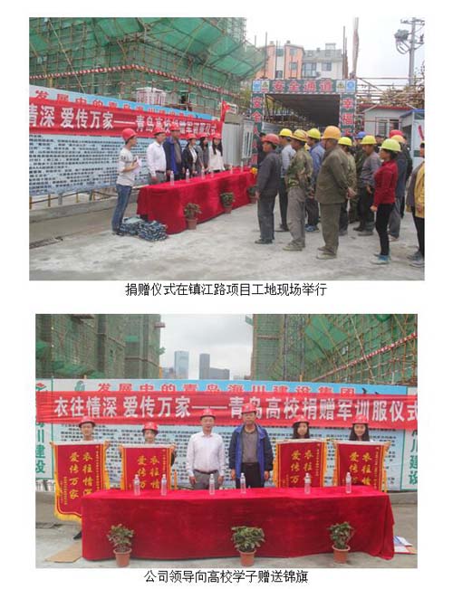 10月16日下午,由青島理工大學(xué)土木學(xué)院學(xué)生會牽頭組織,青島大學(xué)和中國海洋大學(xué)共同參加的“衣往情深,愛傳萬家”軍訓(xùn)服捐贈儀式,在青島海川建設(shè)集團(tuán)鎮(zhèn)江路項(xiàng)目工地隆重舉行。來自青島理工大學(xué)市北校區(qū)、黃島校區(qū),青島大學(xué)和中國海洋大學(xué)的學(xué)生組織代表出席了捐贈儀式,青島海川建設(shè)集團(tuán)副總裁李尊強(qiáng)、團(tuán)委書記王群、六分公司都市逸品項(xiàng)目部經(jīng)理劉峰官以及所在項(xiàng)目部分工人代表出席了捐贈儀式。