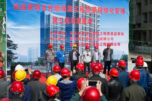 觀摩會當(dāng)天,集團(tuán)副總裁馬志驍、七分公司總經(jīng)理朱超等陪同黃島區(qū)質(zhì)監(jiān)站領(lǐng)導(dǎo)進(jìn)行了現(xiàn)場觀摩,上午9:00黃島區(qū)質(zhì)監(jiān)站領(lǐng)導(dǎo)主持了現(xiàn)場觀摩會,對照實體樣板詳細(xì)講解保溫工程各工序質(zhì)量保證要點。主要就工程實體保溫工程界面劑噴涂、玻纖網(wǎng)粘貼、加強(qiáng)層粘貼、窗洞口巖棉套割、錨栓固定等施工工藝進(jìn)行了講解并宣布現(xiàn)場觀摩開始。黃島區(qū)各與會單位人員現(xiàn)場觀摩了實體工序樣板,各單位間相互切磋工藝做法,交流標(biāo)準(zhǔn)化管理經(jīng)驗。上午11:00觀摩人員陸續(xù)離開施工現(xiàn)場,現(xiàn)場觀摩會圓滿結(jié)束。