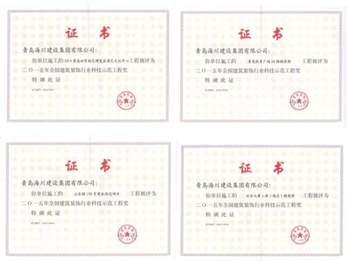 近日,海川集團從中國建筑裝飾協(xié)會捧回4項全國建筑裝飾行業(yè)“科技示范工程”和4項“科技創(chuàng)新成果”的證書和獎牌。分別為: