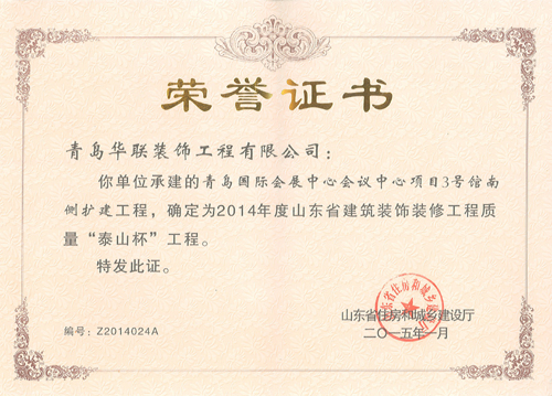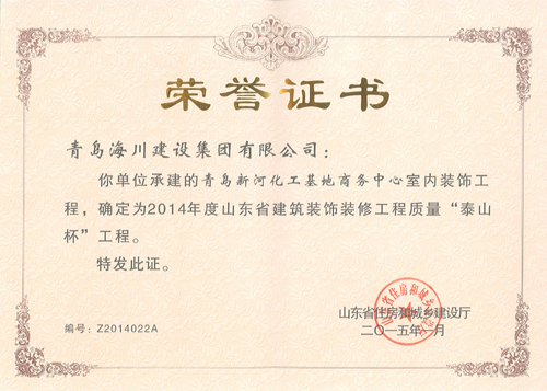 近日,公司從山東省住房和城鄉(xiāng)建設(shè)廳捧回五項泰山杯獎證書,其中2014年度山東省建筑工程質(zhì)量泰山杯工程證書三項;2014年度山東省建筑裝飾裝修工程質(zhì)量“泰山杯”工程證書兩項。