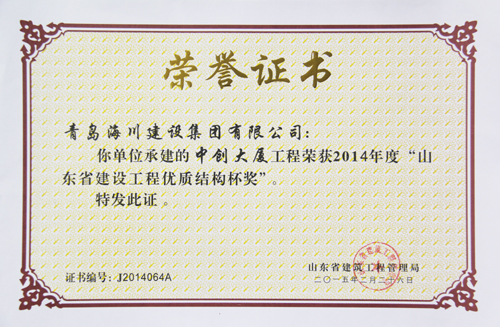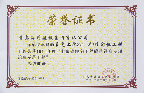 公司最近從省建筑工程管理局接連捧回四項(xiàng)省級榮譽(yù)證書,分別是:一分公司中創(chuàng)大廈工程榮獲“2014年度山東省建筑工程優(yōu)質(zhì)結(jié)構(gòu)杯獎”,四分公司星光上院7#、8#住宅樓工程榮獲“2014年度山東省住宅工程質(zhì)量通病專項(xiàng)治理示范工程”。七分公司青島農(nóng)業(yè)大學(xué)新建科技實(shí)驗(yàn)樓工程接連榮獲“2014年度山東省建筑施工安全文明標(biāo)準(zhǔn)化優(yōu)良工地”和 “2014年度山東省建筑工程優(yōu)質(zhì)結(jié)構(gòu)杯獎”兩項(xiàng)榮譽(yù)。