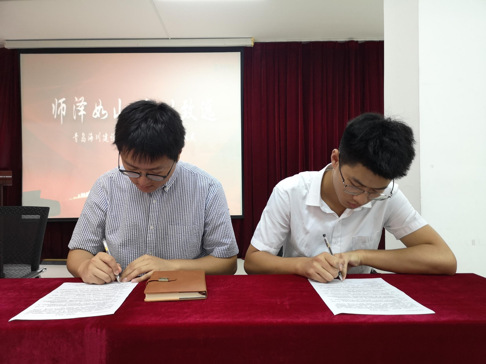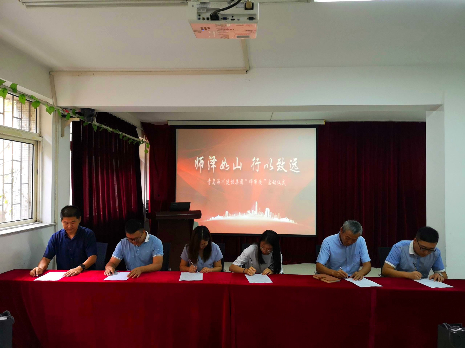 海川商學(xué)院執(zhí)行院長寧楊宣讀《青島海川建設(shè)集團‘師帶徒’協(xié)議書》,隨后師徒雙方簽訂協(xié)議并舉行了莊重的拜師儀式。
